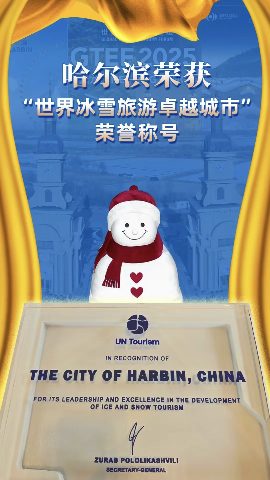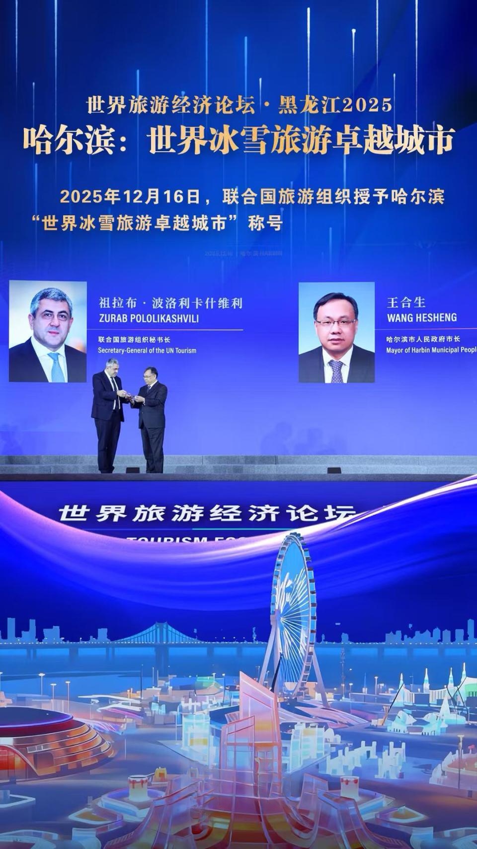 12月16日,第十一届“世界旅游经济论坛·黑龙江2025”在哈尔滨召开,联合国旅游组织授予哈尔滨“世界冰雪旅游卓越城市”荣誉称号。“国际滨”再添殊荣!