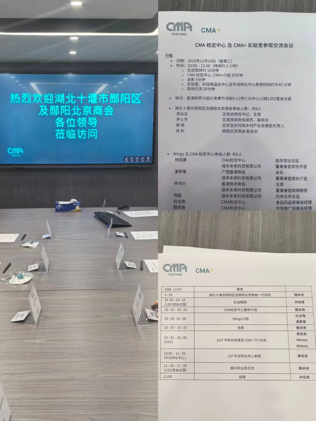 12月16日,“CMA检定中心及CMA+实验室参观交流会议”在香港新界沙田火炭黄竹洋街仁兴中心举行,Wings及CMA检定中心有关领导,郧阳区政协党组书记、主席党永生,区发改局党组成员、副局长尹士杰,区农业农村局乡村产业发展股负责人熊丽,郧阳北京商会副会长、郧商商务(北京)有限公司董事长肖利,郧阳北京商会副会长、北京嘉和环境有限公司董事长简兵等参加会议。活动期间,与会人员一行还参观了中央实验室、科技商品化中心及中试转化中心。